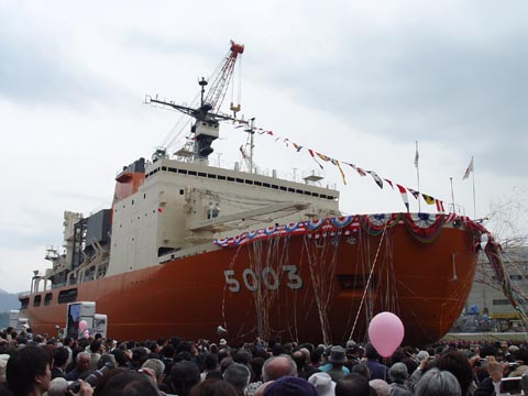 新南極観測船の進水式 新たに建造中だった南極観測船の命名式・進水式が行われました。 関係者や一般市民が見守る中、真新しい船体がドッグから舞鶴湾に曳き出されました。