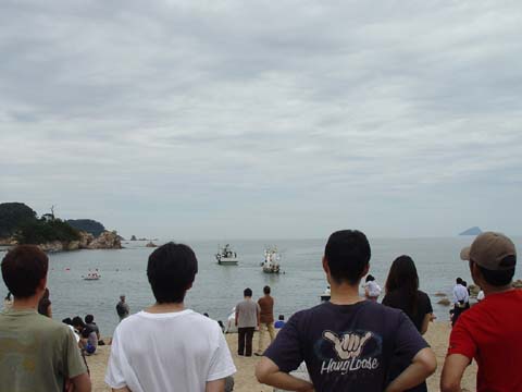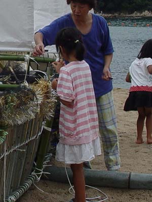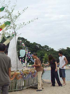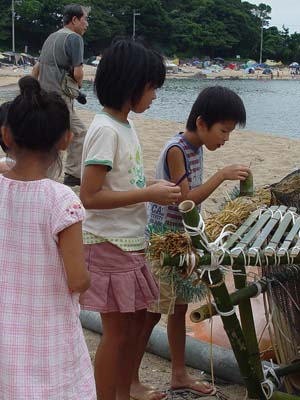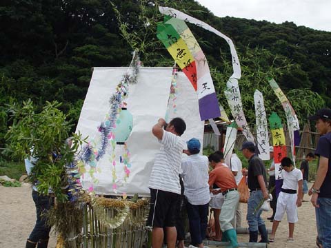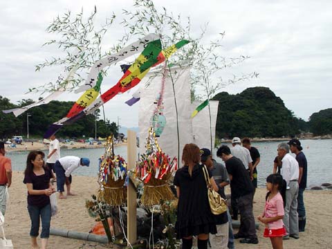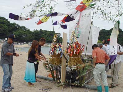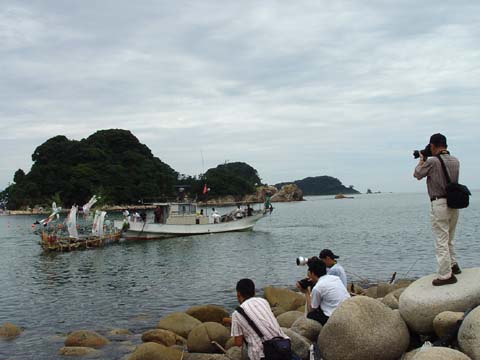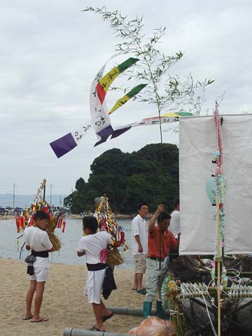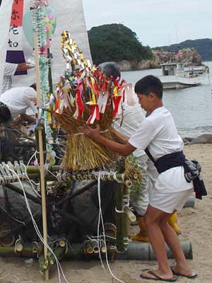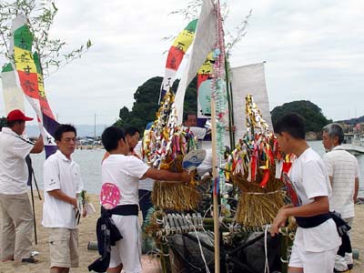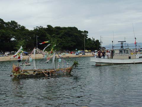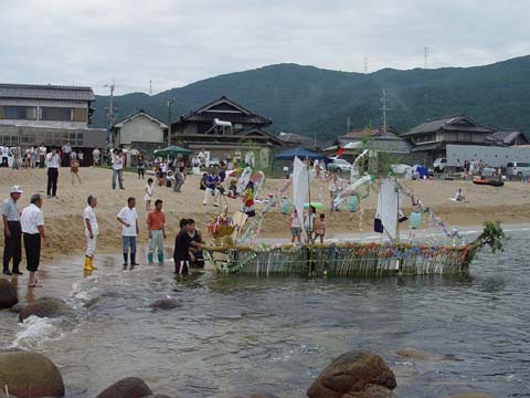 竹やわらで組まれた小船にお飾りやお供え物が積み込まれます。 近所の人たちも次々とお参りをした後、 近くのお寺で法要を終えた先祖の霊とお飾りが積み込まれ、 子ども達が乗り込んだ漁船によって沖合いの冠島のあたりまで曳かれていきます。