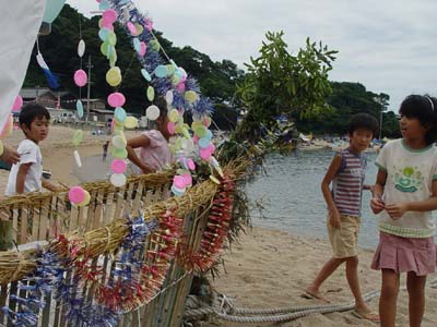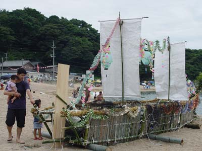 小橋の精霊船 若狭湾に面した小橋(おばせ)の竜宮浜で 地区の子ども達によるお盆の行事、精霊船(しょうらいぶね)が行われました。