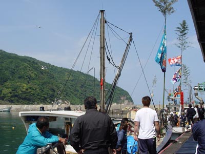 | 水揚が終わったばかりの漁船に、大漁旗や奉納旗が飾られ、祭りの準備が進む。 | |